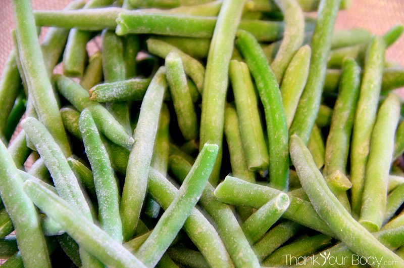 I found that they sell huge bags of frozen organic green beans at a warehouse store where I shop, and I always keep a bag of them in my freezer. They are a great quick side dish when I don’t have anything fresh, and they work well for these green bean snacks. Toss them in a strainer and run warm water over them and they’re ready to go! If you have fresh green beans, just wash them and blanch them for a few minutes in boiling water, then drain them and set them aside.